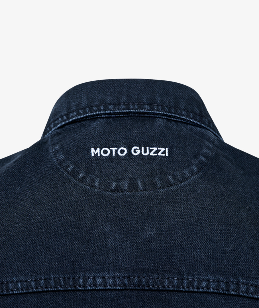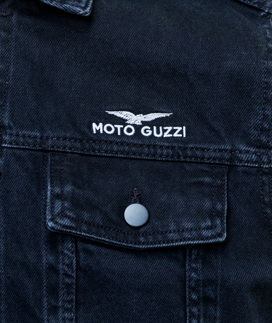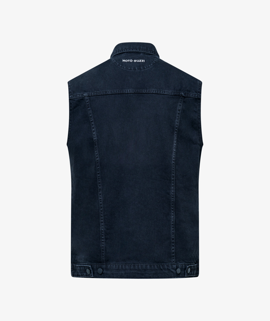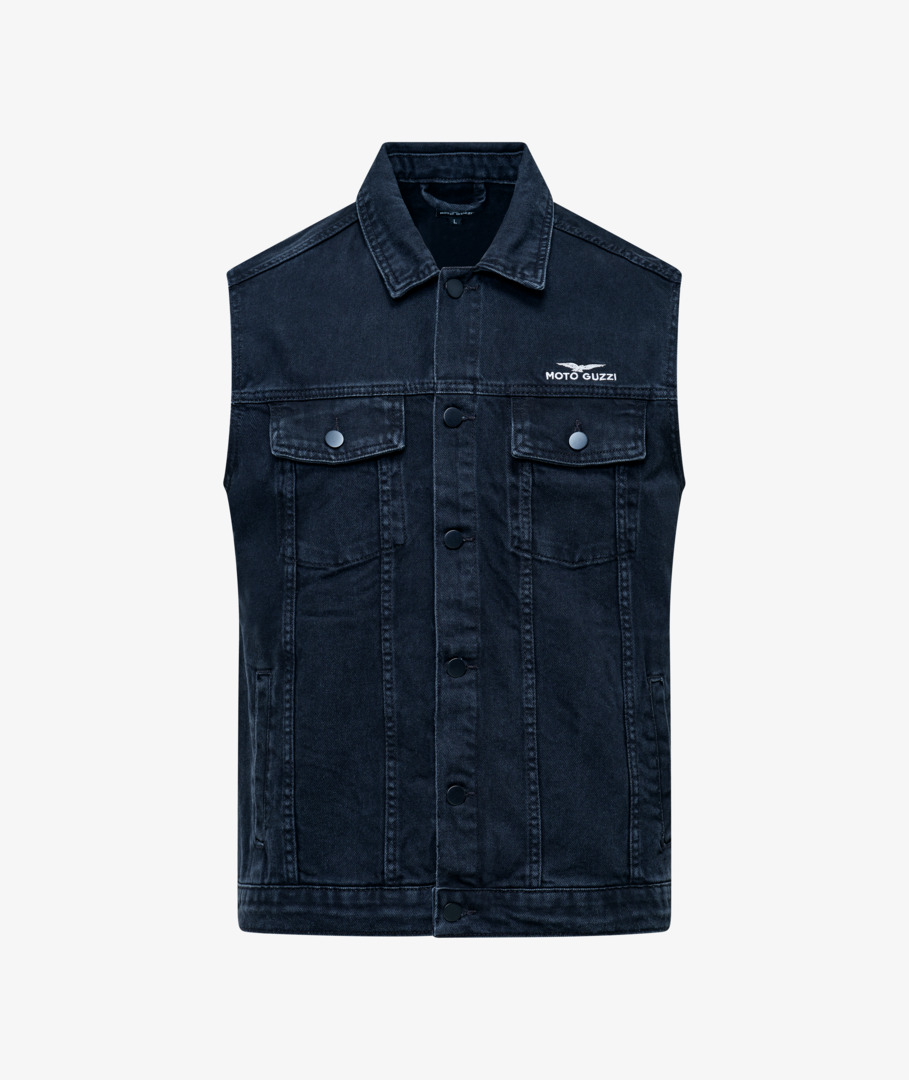 Gilet en denim 100 % coton, avec double poche frontale et poches latérales. Logo Moto Guzzi brodé sur le devant et le dos à la hauteur du col. Boutons en métal mat.