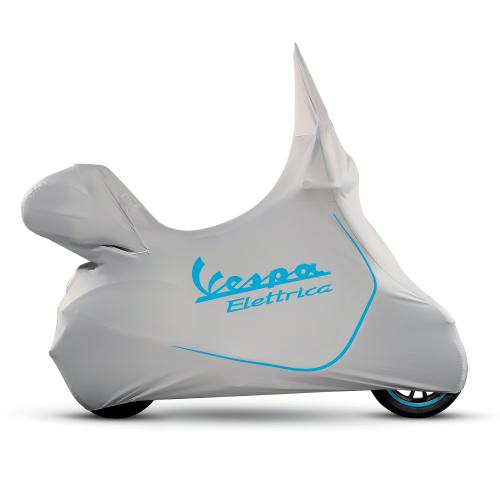 Housse de scooter d’intérieur de qualité supérieure, modelée sur la forme de la Vespa, avec des ouvertures pour des accessoires supplémentaires. Logo Vespa Elettrica.