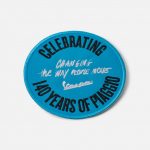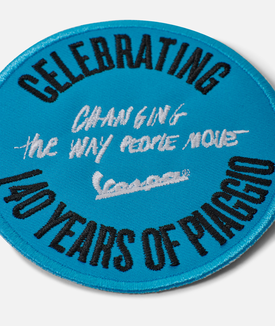 Écusson arrondi en tissu, à coudre sur le vêtement, représentant le graphisme du 140e anniversaire de Piaggio et le logo Vespa.