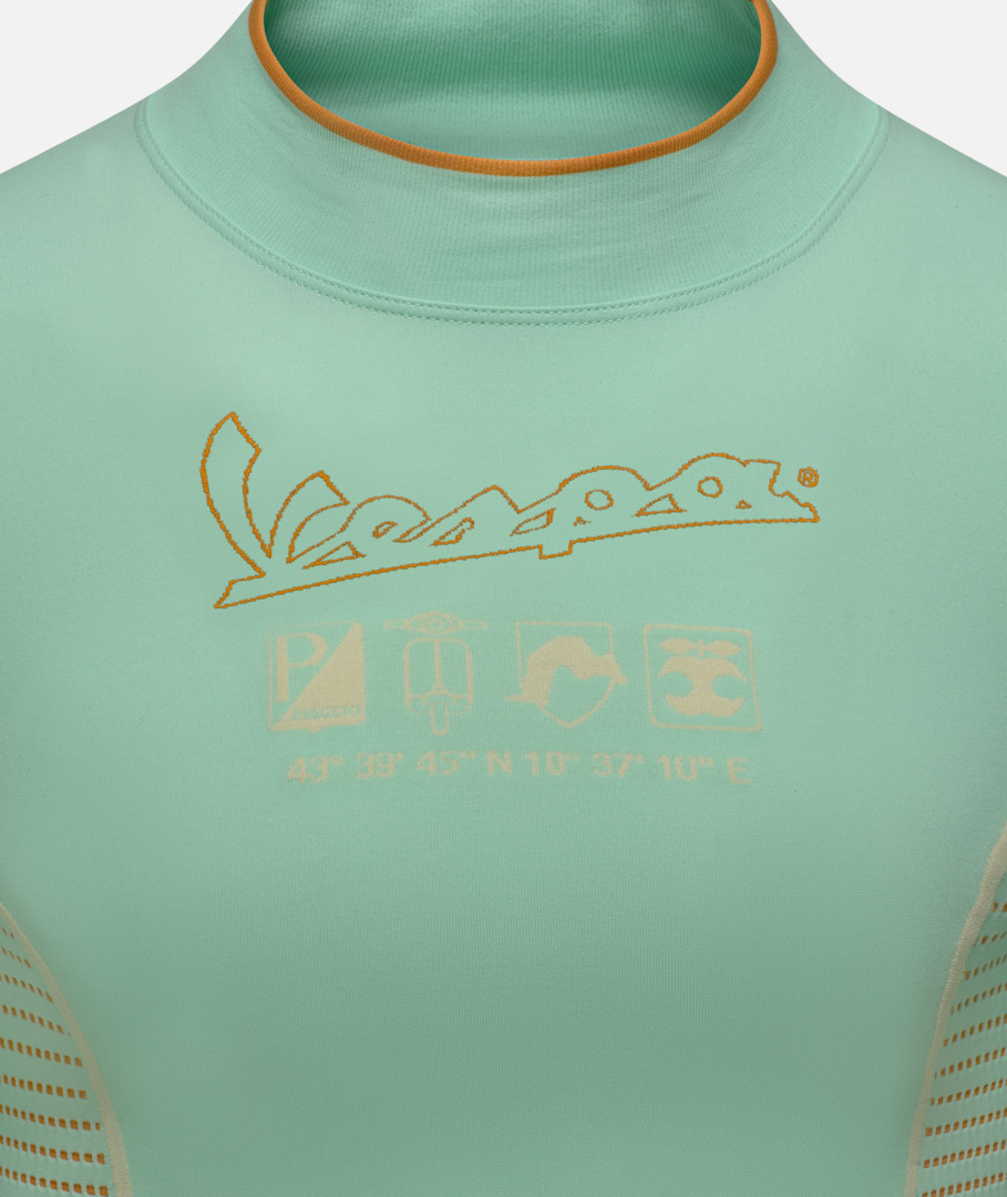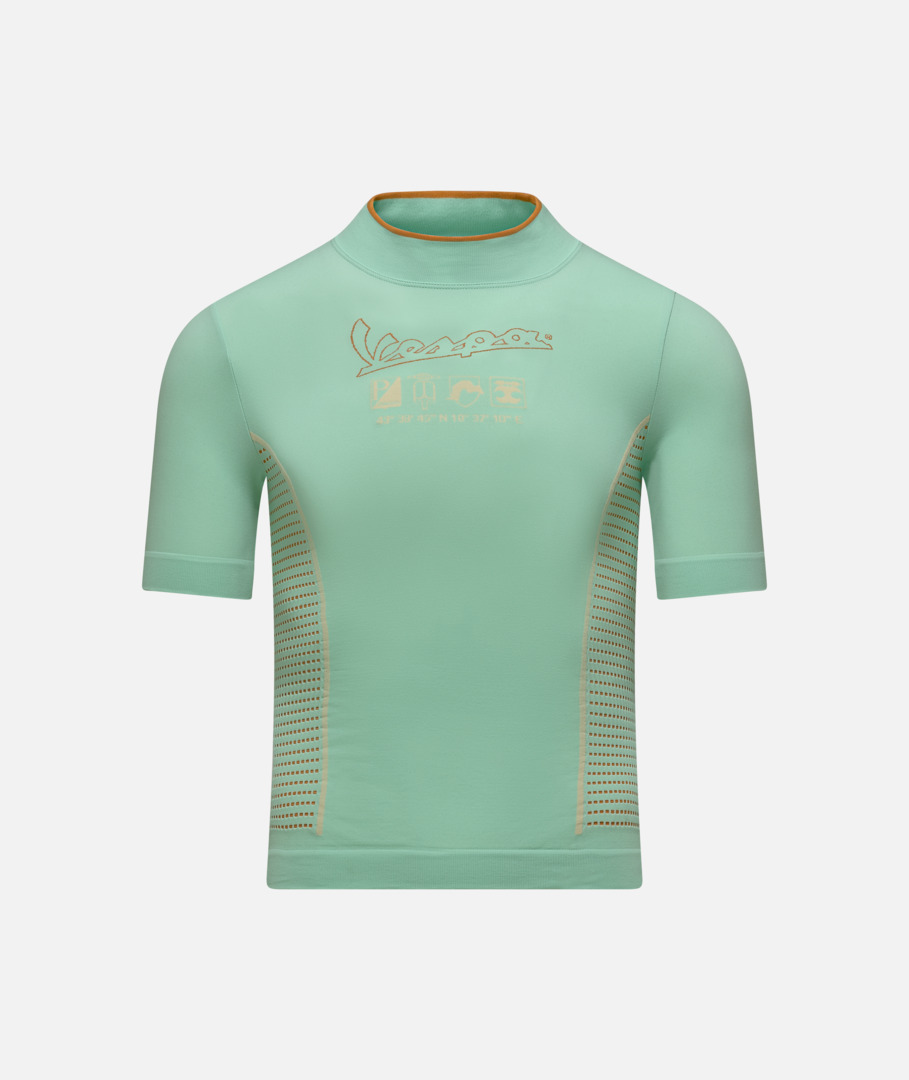 Tee-shirt ajusté sans couture, doux et confortable, avec le logo emblématique Vespa en jacquard et le nouveau graphisme Vespa DEC sur le devant.
