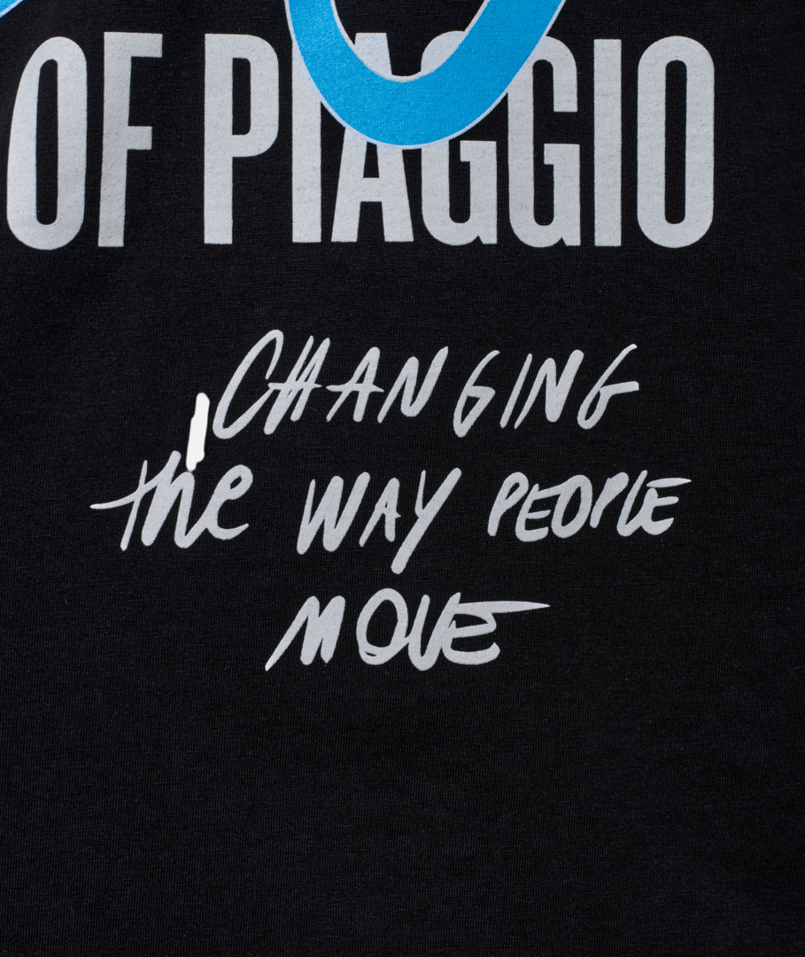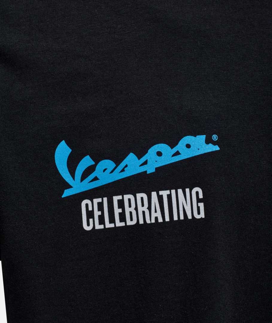 T-shirt confortable en tissu 100 % coton. Le graphique du 140e anniversaire de Piaggio et le logo Vespa sont imprimés à l’avant et à l’arrière.