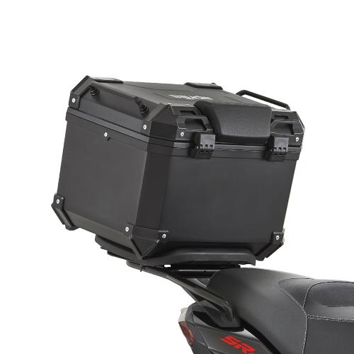 Top case carré en ABS ultra résistant, spacieux et capable d’accueillir un casque intégral. Equipé d’une fermeture hermétique qui empêche les infiltrations d’eau et de poussière. Logo Aprilia sur le dessus et dosseret inclus. Rembourrage intérieur amovible. Serrure à clé personnalisée avec logo Aprilia. Support arrière 1B010064 à acheter séparément.